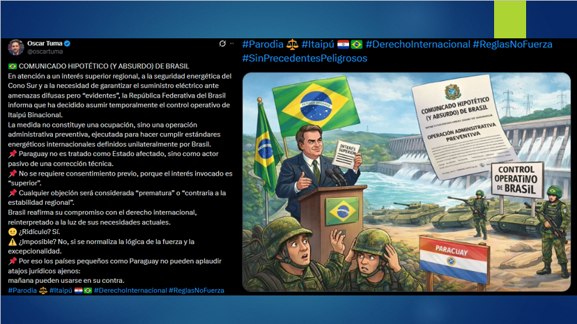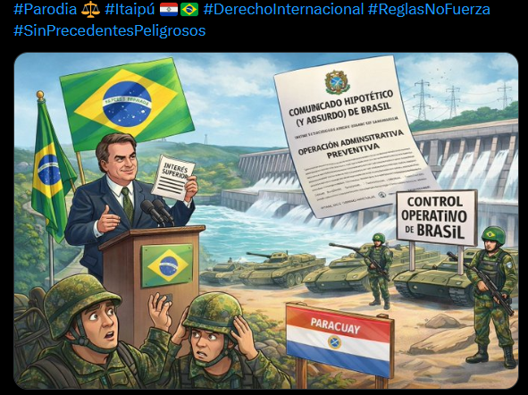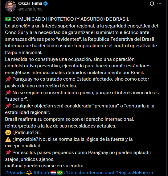 El comunicado hipotético y absurdo presentado por Oscar Tuma en Twitter plantea un escenario preocupante sobre la fragilidad de las relaciones internacionales y la vulnerabilidad de los estados más pequeños ante la lógica de la fuerza y la excepcionalidad. El texto simula un comunicado oficial de Brasil en el que, bajo el pretexto de un «interés superior regional» y la «seguridad energética del Cono Sur,» anuncia la toma de control operativo de Itaipú Binacional, una represa hidroeléctrica compartida con Paraguay.
