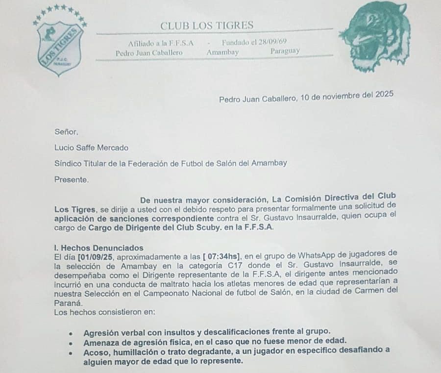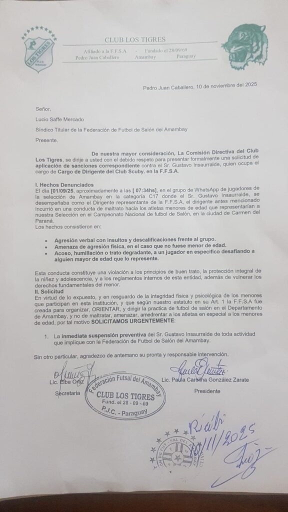 El club Los Tigres presentó una nota solicitando sanciones contra Gustavo Insauralde, dirigente del club Scuby de la Federación de Fútbol de Salón de la Amambay. La denuncia se basa en hechos ocurridos el 1 de octubre de 2025 en un grupo de WhatsApp de jugadores menores de la Selección Amambay categoría C-17.